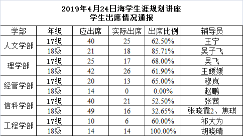 2019年4月24日海学生涯规划讲座学生出席情况通报