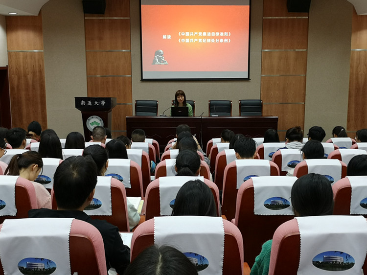 10月31日,学院党委在启东校区图书馆报告厅举办“不忘初心、牢记使命”主题教育专题党课。学院专职纪检监察员钱亮华解读《中国共产党廉洁自律准则》和《中国共产党纪律处分条例》。活动由学院党群工作处副处长王宁主持。