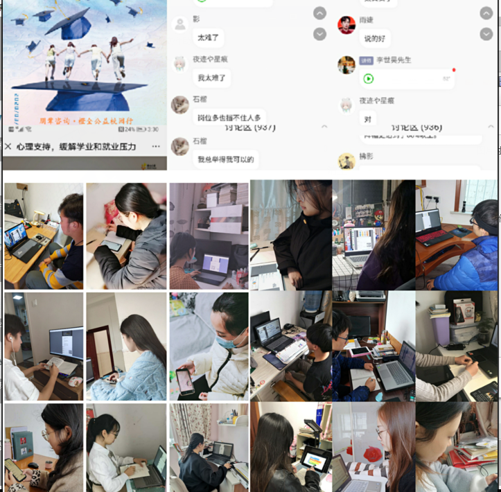 本次“心理支持——缓解学业和就业压力”公益直播课期间,同学们认真观看直播,积极参与互动,对就业认知和学习方法有了更深入的了解,因而明确了自身的学习、职业和人生目标,面对学业和就业繁重压力的同时,学会放松心情,科学调适,实现自我目标。