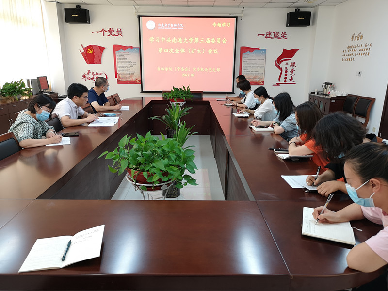 又讯 9月22日,机关党支部召开支部会议,专题学习中共南通大学第三届委员会第四次全体(扩大)会议精神。
