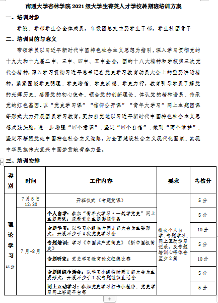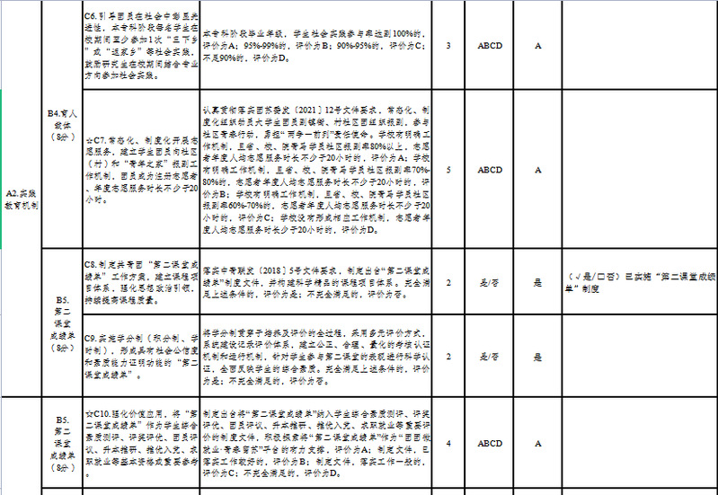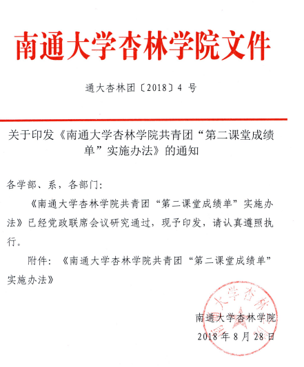 2018年9月学院制定《南通大学杏林学院共青团“第二课堂成绩单”实施办法》,并编入《学生手册》。同时,制定“第二课堂成绩单评分表”,对8个类别42个项目的“素质综合测评记分”和“素质拓展课程学分认定”标准,做出明确规定。
