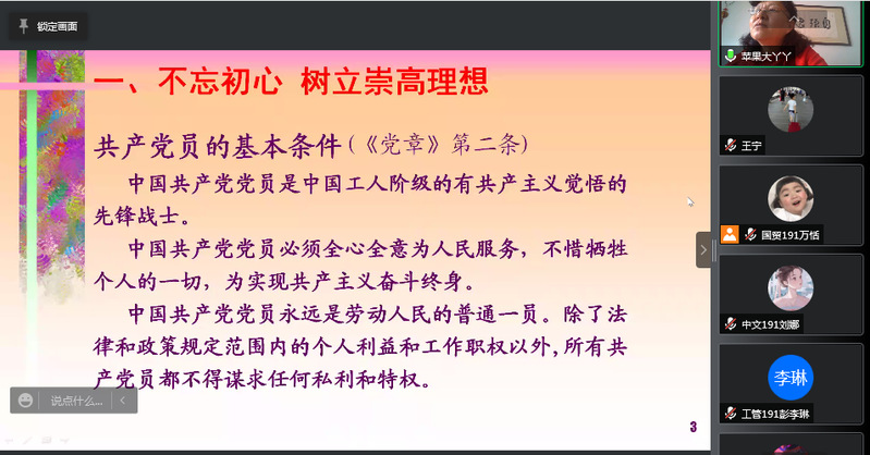 周逸萍以“加强党性修养,争做合格党员”为主题,选用先进典型事例,向同学们详细讲解了共产党员的基本条件,重点强调作为一名合格的共产党员要树立崇高的理想和信念,牢记初心和使命。