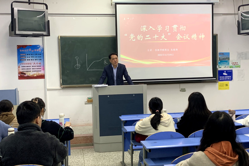 朱晓阳从二十大主题和主要成果、过去5年的工作和新时代10年的伟大变革、马克思主义中国化时代化、中国式现代化、全面建设社会主义现代化国家的目标任务、坚持党的全面领导和全面从严治党、应对风险挑战等七个方面全面系统宣讲了党的二十大精神,鼓励同学们用实际行动学习宣传党的二十大精神。