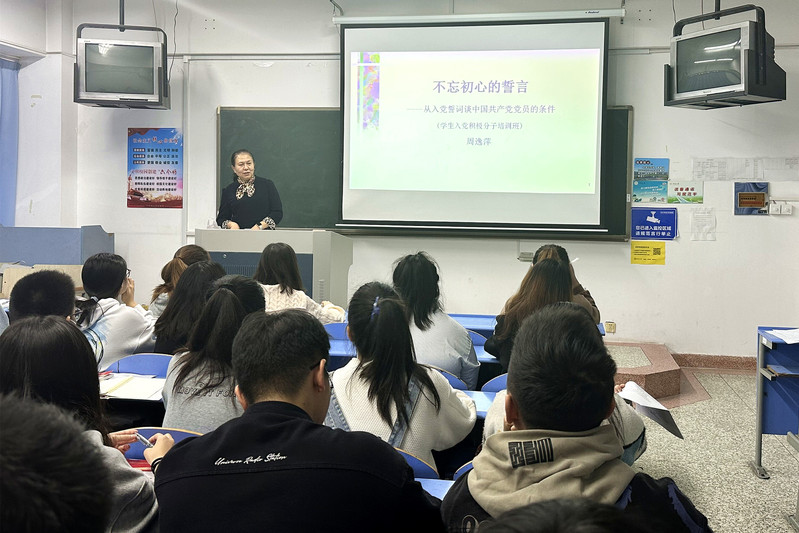 周逸萍以“不忘初心的誓言”为主题,以入党誓词为切入口解读共产党员标准,引领同学们从入党誓词的历史演变中追寻不变的初心和坚定的信仰。鼓励同学们树立共产主义信念、牢记党的宗旨、在实践中践行入党誓词、争做优秀共产党员。