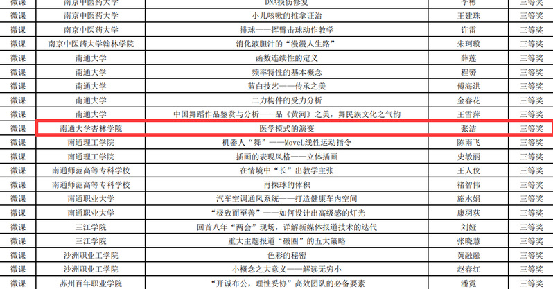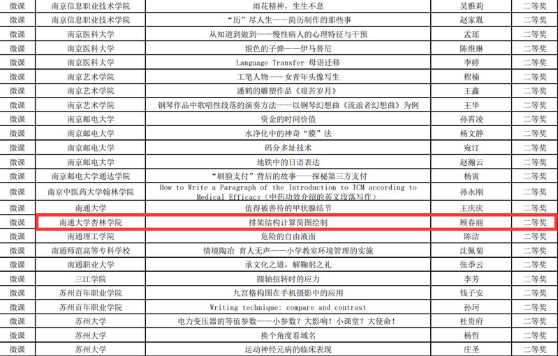 近日,江苏省高校微课教学比赛落下帷幕。我院工学部顾春丽老师课程《排架结构简图绘制》获得二等奖,医学部张洁老师课程《医学模式的演变》获得三等奖。