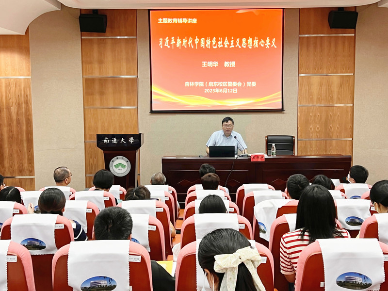 在专题辅导报告会上,南通市委理论宣讲团成员、党的十九大、二十大精神师生巡讲团成员、校硕士生导师王明华教授应邀作《习近平新时代中国特色社会主义思想核心要义》辅导讲座。结合主题教育的开展要求,王明华强调了全面学习领会习近平新时代中国特色社会主义思想核心要义的必要性和重要性。他从“新时代坚持和发展什么样的中国特色社会主义、怎样坚持和发展中国特色社会主义;建设什么样的社会主义现代化强国、怎样建设社会主义现代化强国;建设什么样的长期执政的马克思主义政党、怎样建设长期执政的马克思主义政党”三大时代课题着手,深刻讲述习近平新时代中国特色社会主义思想回答的主要问题;并引用大量历史文献和理论依据深入浅出的阐明了习近平新时代中国特色社会主义思想的主要内容、世界观和方法论、以及历史地位,为与会同志学习领会党的创新理论提供了指引和启迪。