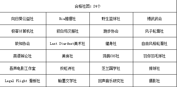 筑梦青春公益社等2个学生社团考核优秀,童梦爱心公益服务社等21个社团考核良好,Legal Flight 滑板社等24个社团考核合格。