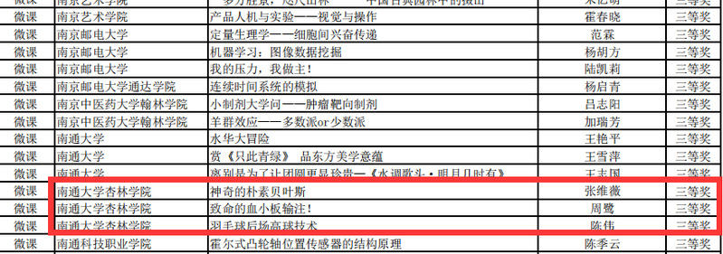 近日,江苏省高校微课教学比赛落下帷幕。我院人文思政与艺术体育学部教师陈伟的微课作品《羽毛球后场高球技术》、工学部教师张维薇的微课作品《神奇的朴素贝叶斯》以及医学部教师周鹭的微课作品《致命的血小板输注!》荣获三等奖。