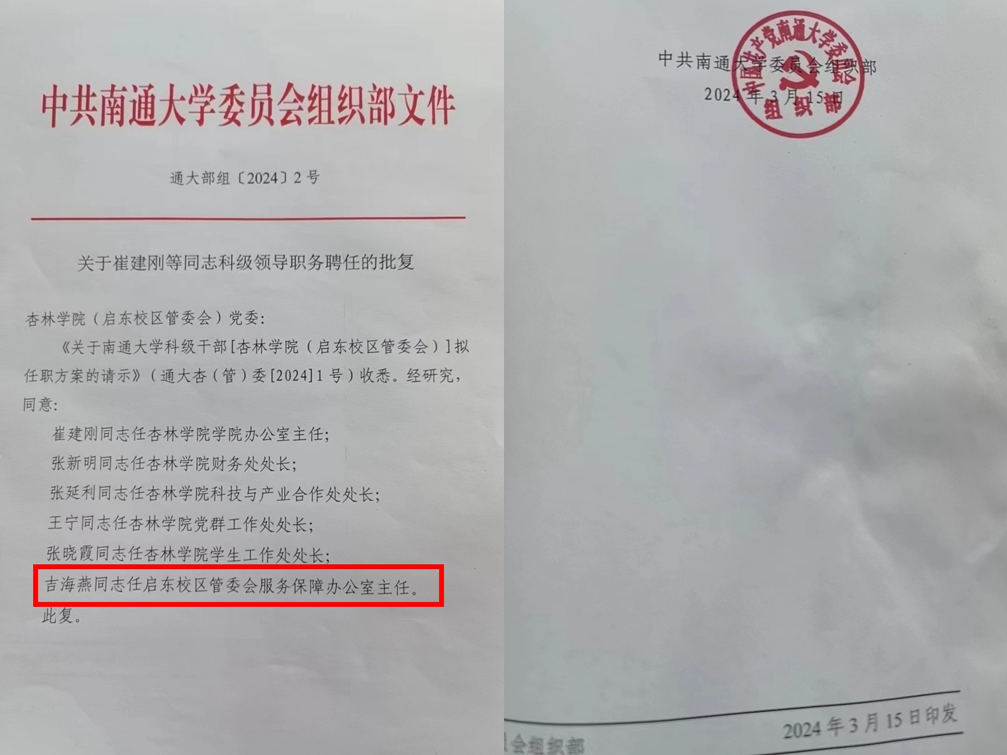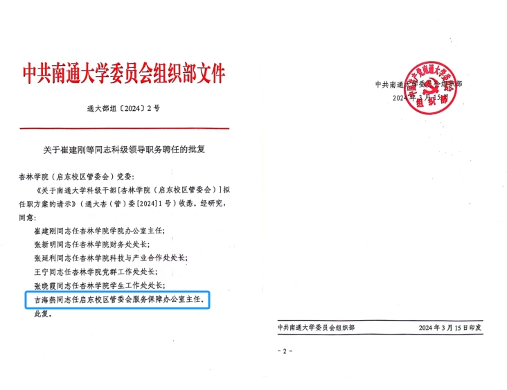 根据南通大学党委组织部的批复(见附件),吉海燕同志任启东校区管委会服务保障办公室主任,任职时间自2024年3月15日起计。