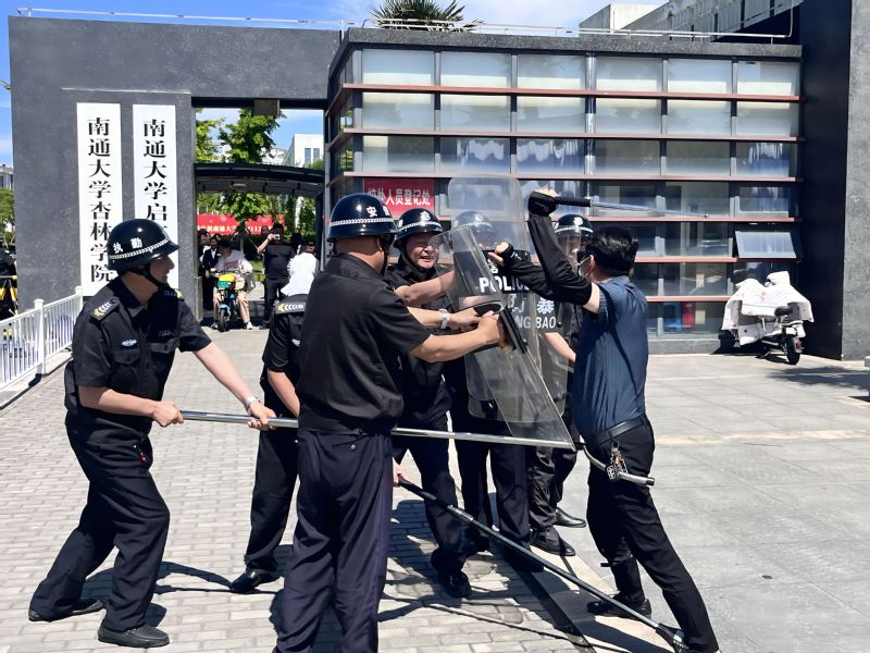 演练以“实装、实景、实训”方式进行,演练中模拟一名“歹徒”强行闯入校园,欲持械行凶。学校安保人员第一时间报警并启用紧急预案,携带钢叉、防暴棍等器械阻止“歹徒”闯入。塘芦港派出所接到报警后,立即赶赴现场处置,成功将“歹徒”制服抓获。整个演练过程气氛紧张、配合默契,达到预期效果。
