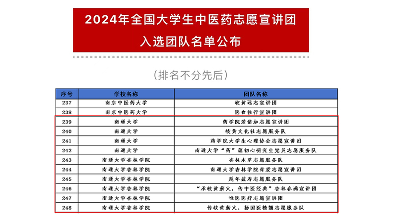 又讯 近日,团中央青年志愿者行动指导中心、国家中医药管理局、北京中医药大学、中国青年志愿者协会等联合发布《2024年全国大学生中医药志愿宣讲团入选团队名单》。学院青爱志愿宣讲团、杏林本草志愿服务队、延年益寿志愿服务队、“承岐黄薪火 传中医经典”杏林春满宣讲团、唯医医疗志愿宣讲团等6支团队和学校4支团队成功入选。