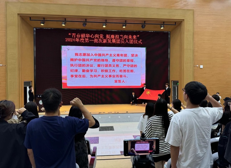 活动中,全体人员齐唱国歌,团委副书记(主持工作)高青松宣读新发展团员名单并带领团员进行入团宣誓,各学部共青团负责人为新发展团员代表佩戴团徽,新团员代表、优秀团员代表上台发言,呼吁团员们牢记使命与职责。仪式最后,全体起立,齐唱团歌,在嘹亮的歌声中,我院2024年度第一批次新发展团员入团仪式落下帷幕。