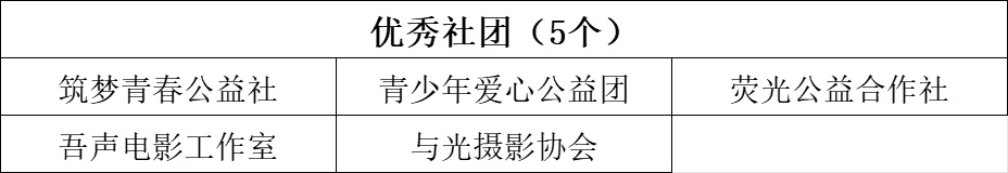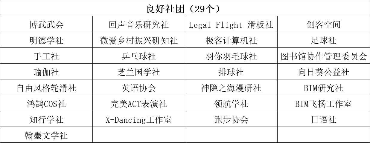 筑梦青春公益社等5个学生社团考核优秀,博武武会等29个社团考核良好,舞蹈社等12个社团考核合格,。