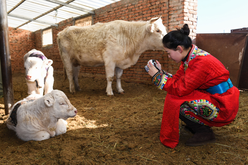 2019年1月10日,家住内蒙古自治区西乌珠穆沁旗的“95”后蒙古族姑娘乌音嘎在棚圈中拍摄牛犊。新华社记者 刘磊 摄