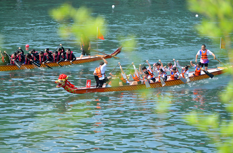 2024年8月10日,湖北省恩施土家族苗族自治州宣恩县城区贡水河上,选手在第十二届全国少数民族传统体育运动会“同心畅享”系列活动——全国龙舟邀请赛200米直道赛预赛中。新华社发(宋文 摄)