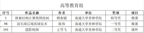 近日,2024年“领航杯”江苏省教师信息素养提升实践活动评审结果在江苏省教育厅官网公示。此次实践活动,高等教育组设微课、案例、课件三个赛项,全省共202件作品获奖。我院顾春丽老师“排架结构计算简图绘制”获微课特等奖,排名第一;陈伟老师“羽毛球后场高球技术”获微课一等奖;王雪飞老师“摄影构图”获课件二等奖。