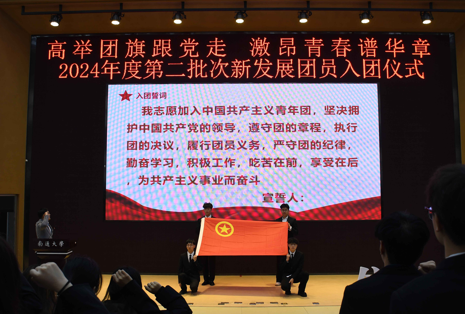 院团委副书记焦琪宣读2024年第二批发展名单,院团委副书记高青松带领新发展团员入团宣誓,各学部共青团负责人为新发展团员佩戴团徽。新老团员作为代表分别发言,活动在团歌合唱中落下帷幕。团歌激荡着青春的热血,激励着每一位团员将个人理想与民族复兴的伟大梦想相结合。