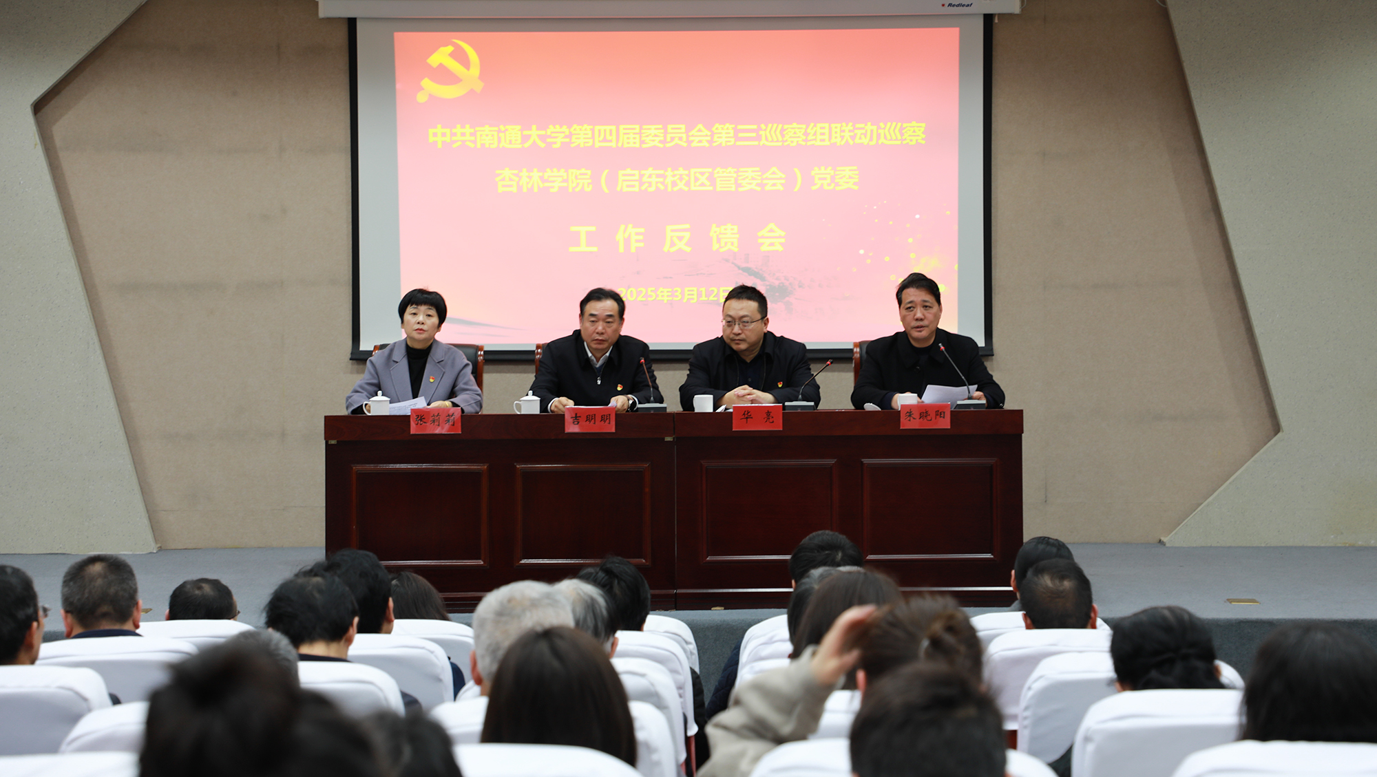 3月12日,校党委第三联动巡察组向学院(管委会)党委反馈巡察情况。校党委常委、副校长、杏林学院理事长吉明明出席会议并提整改要求。党委第三联动巡察组组长、校党委常委、副校长华亮代表联动巡察组向学院(管委会)党委反馈巡察情况。学院(管委会)党委书记、启东校区管委会常务副主任朱晓阳主持会议并作表态发言。