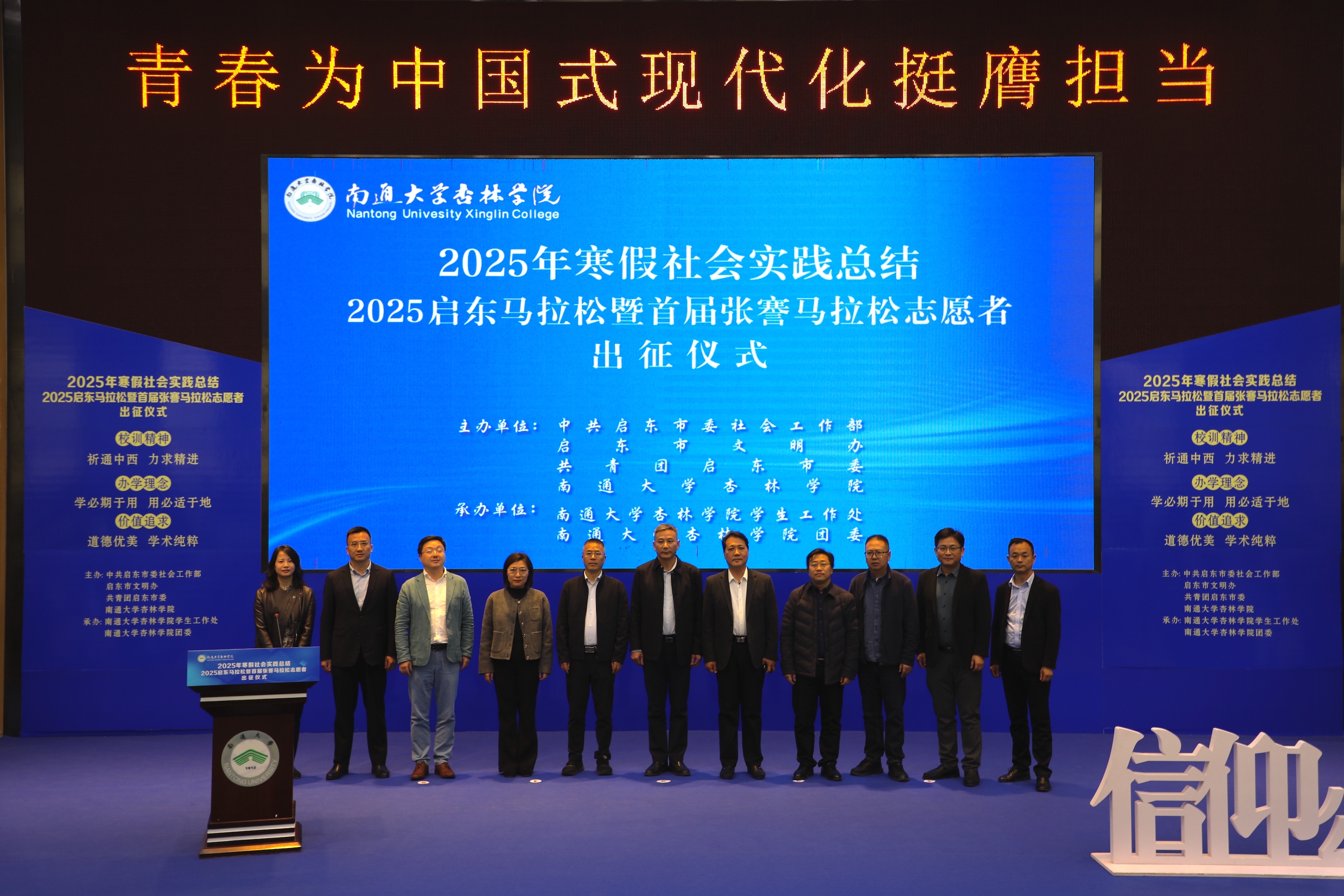 3月24日下午,我院在启东校区大活报告厅隆重举行2025年寒假社会实践总结、2025启东马拉松暨首届张謇马拉松志愿者出征仪式。启东市委社会工作部部长、“两新”工委书记王兴建,启东市委社会工作部副部长梁俊锋,启东市委宣传部副部长、文明办主任朱卫强,共青团启东市委书记吴奇蒙,学院(管委会)党委书记、启东校区管委会常务副主任朱晓阳,学院(管委会)党委副书记、院长茅靖峰等学院(管委会)在启全体党政领导出席活动。