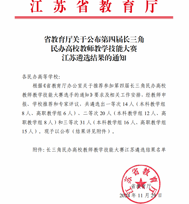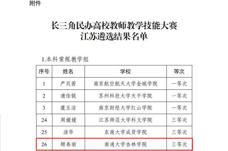 近日,由上海市教育委员会、江苏省教育厅、安徽省教育厅和浙江省教育厅联合举办的第四届长三角民办高校教师教学技能大赛江苏遴选赛结果公布。我院教师顾春丽凭借扎实的专业功底、精湛的教学技能和创新的教学思路,以及充满激情的现场说课,在此次选拔赛中斩获佳绩。