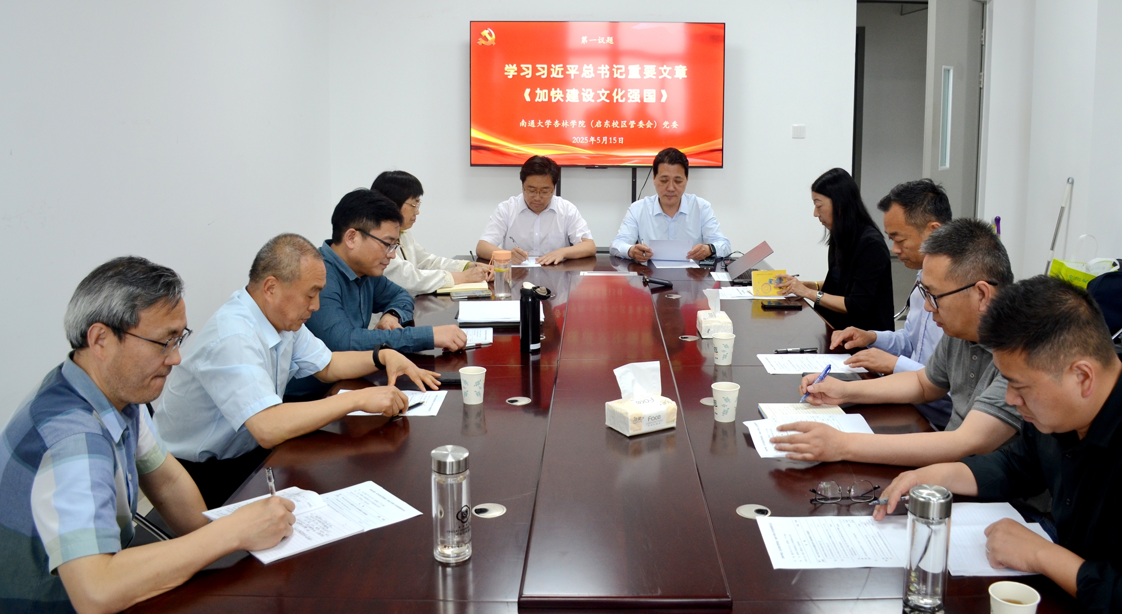 5月15日,学院(管委会)党委理论学习中心组学习习近平总书记在4月16日《求是》杂志发表的重要文章《加快建设文化强国》。学院(管委会)党委书记、启东校区管委会常务副主任朱晓阳领学文章并讲话。