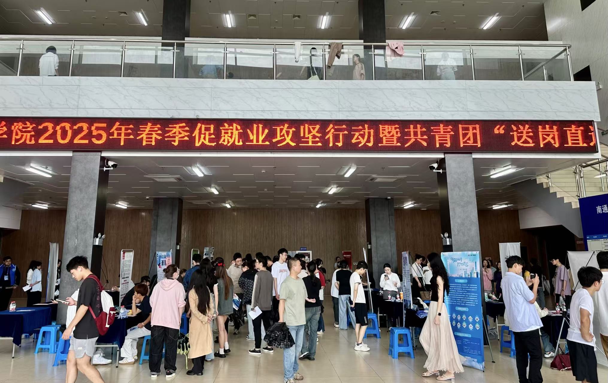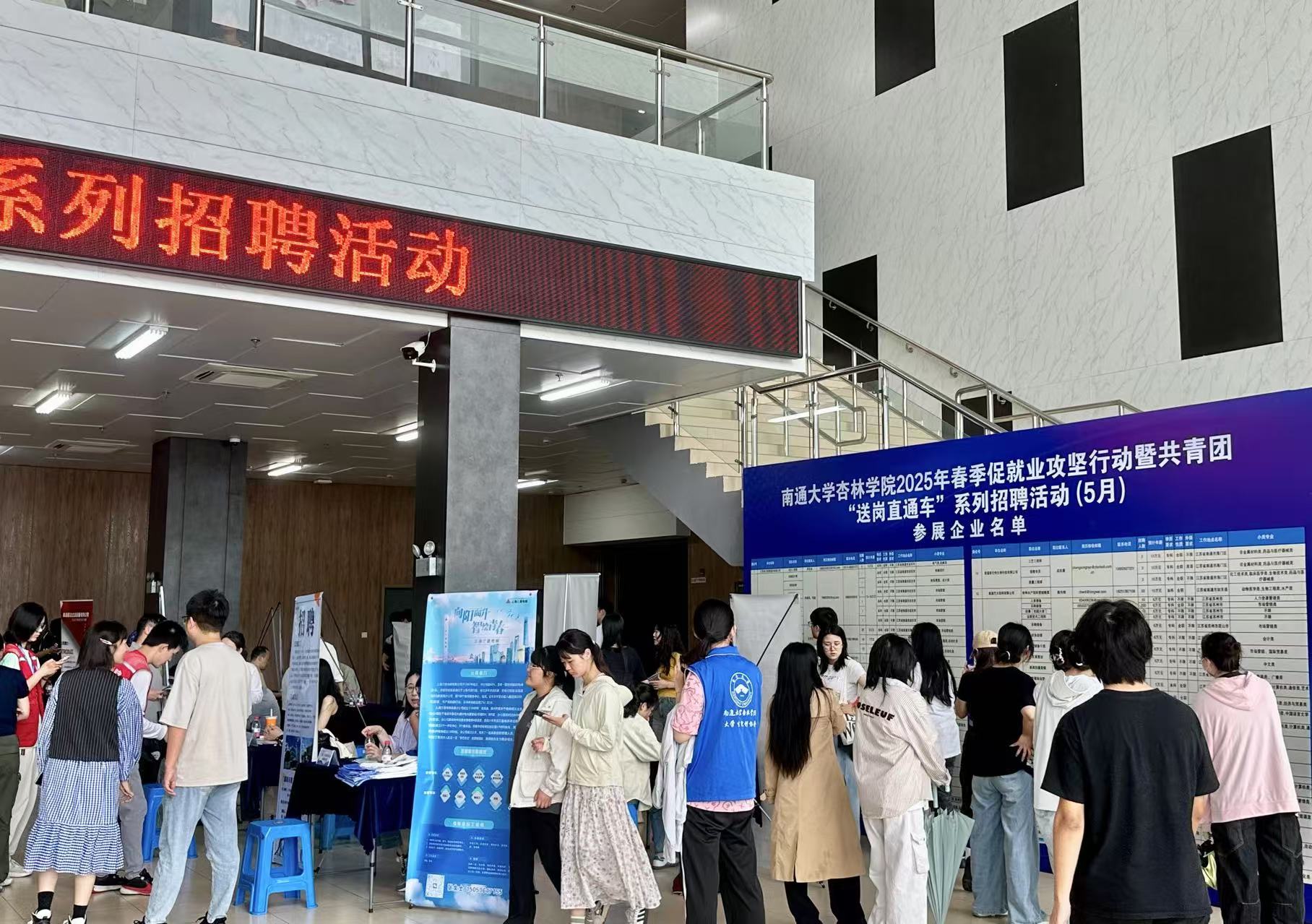 5月21日下午,我院在启东校区体育馆成功举办“服务新质生产力,校地强链促就业”南通大学杏林学院2025年春季促就业攻坚行动暨共青团“送岗直播车”系列招聘活动(5月)。