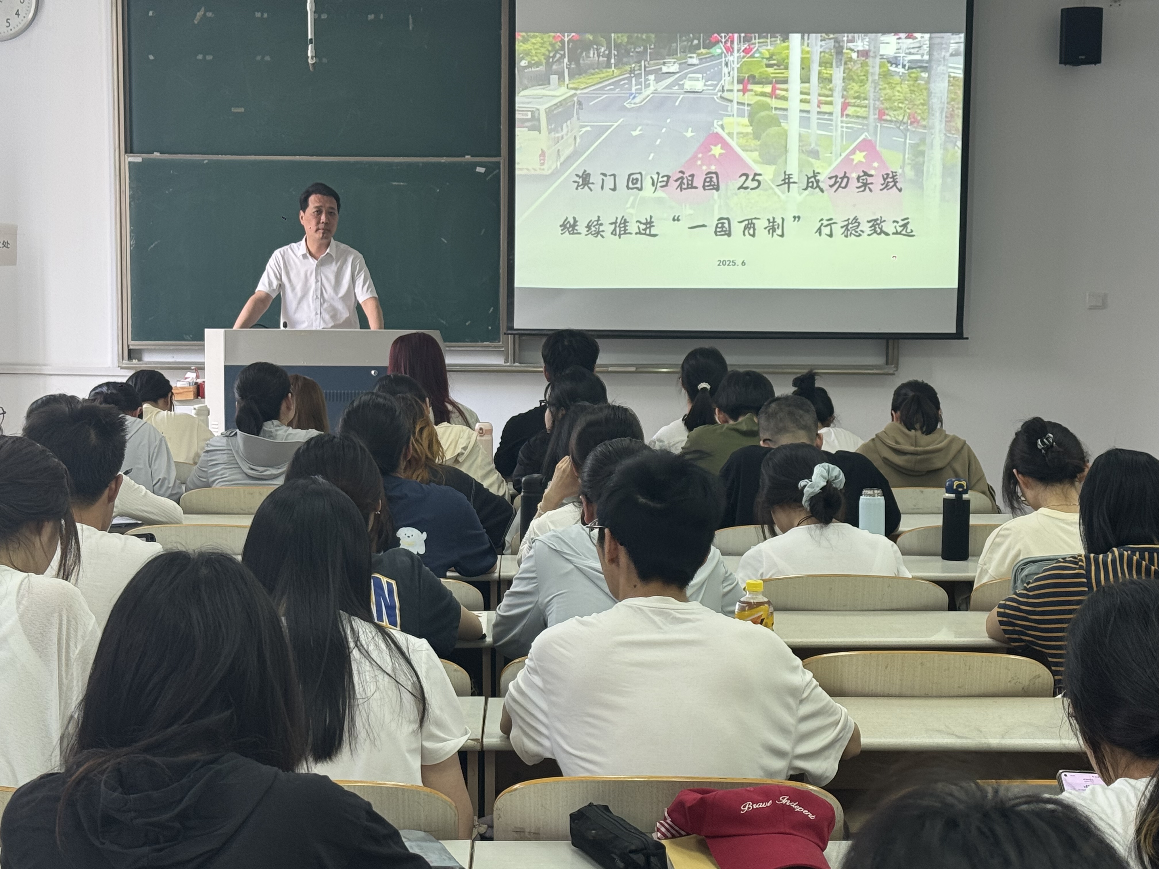 6月5日上午,学院(管委会)党委书记、启东校区管委会常务副主任朱晓阳为医学部学生带来一堂生动的《形势与政策》专题课。本次课程以“澳门回归祖国25年成功实践 继续推进'一国两制'行稳致远”为主题,通过深入浅出的政策解读、生动的案例分析和热烈互动的交流研讨,帮助学生准确把握国家发展大势,明确新时代青年的使命责任。