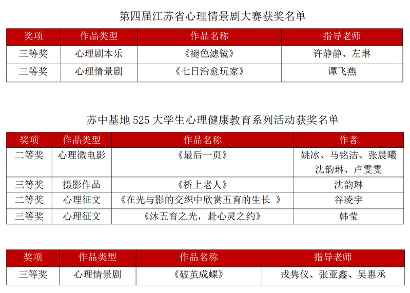 近日,各项比赛评选结果已公布,在第四届江苏高校心理情景剧大赛中,我院心理剧本乐《褪色滤镜》获得三等奖,心理情景剧《七日治愈玩家》获得三等奖。在苏中基地原创作品征集中,我院心理微电影《最后一页》获得二等奖,摄影作品《桥上老人》获得三等奖,征文作品《在光与影的交织中欣赏五育的生长》和《沐五育之光,赴心灵之约》分别获得二等奖和三等奖,心理情景剧《破茧成蝶》获得三等奖。