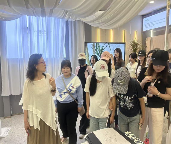通过参观家纺设计展,学生们近距离观察面料纹理、色彩搭配与图案设计,与参展设计师交流设计理念与市场需求,对家纺艺术的实用性与审美性有了更直观认知。展厅中,学生们对现代AI技术对家纺产业的影响进行了深入了解,通过AI进行图案设计、智能分析花纹面料,以及智能系统在提升家纺设计方面的效率与准确性上的突出优势,深刻领会科技对行业升级的核心推动作用。