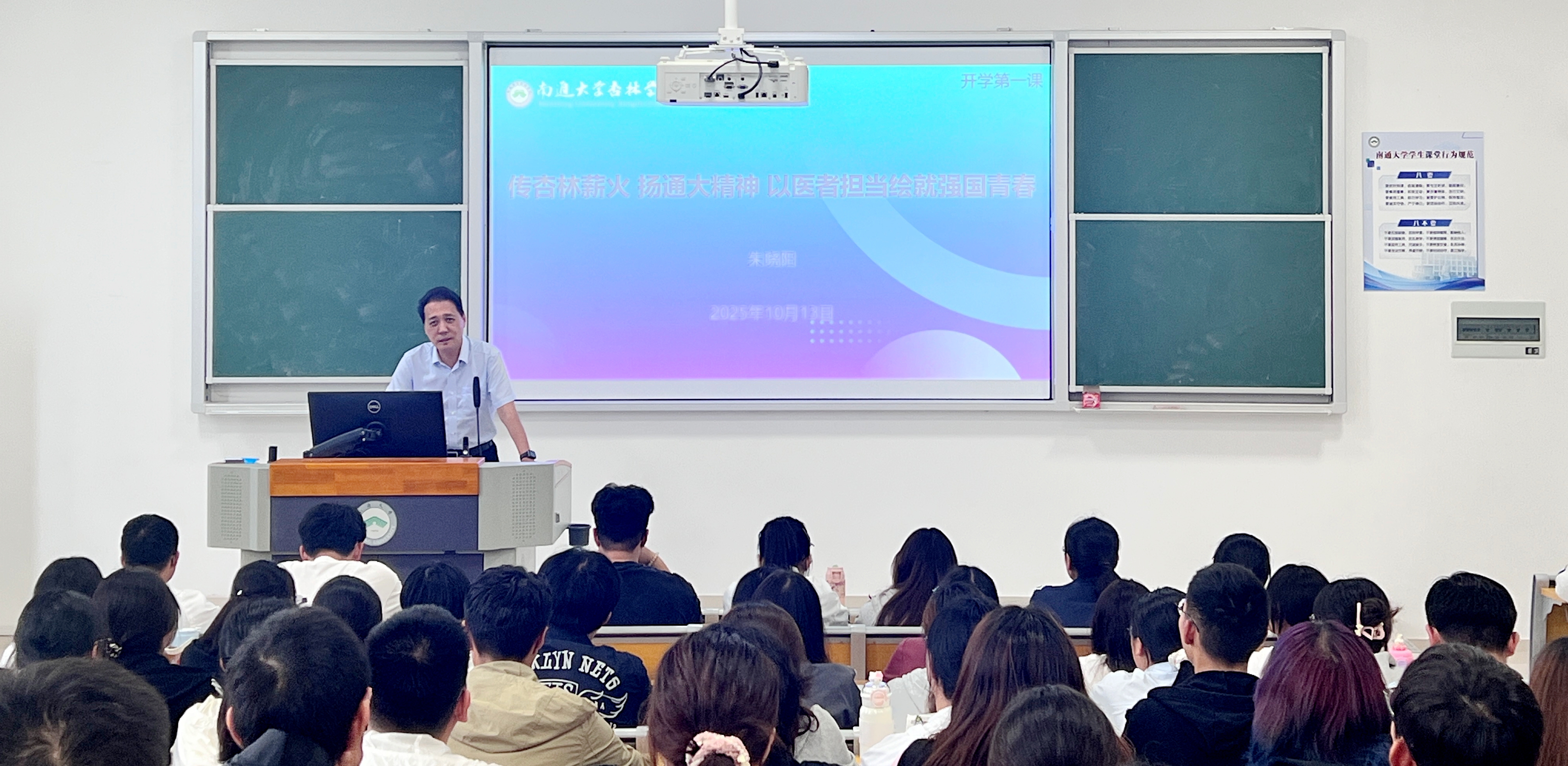 10 月 14 日下午,学院(管委会)党委书记、启东校区管委会常务副主任朱晓阳在啬园校区为大一医学生做了题为《传杏林薪火 扬通大精神 以医者担当绘就强国青春》的讲座。