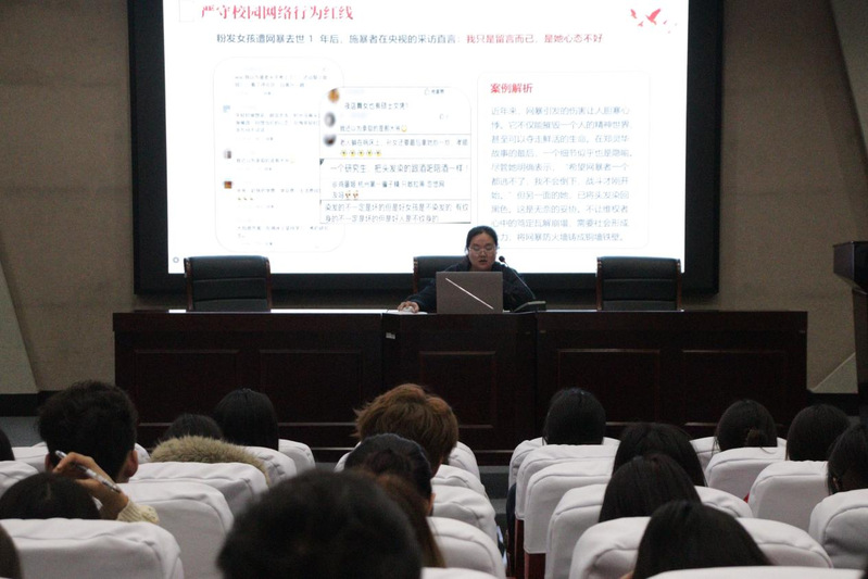 陈赟围绕法治教育与大学生成长主题,从三个维度展开系统讲解。首先她结合法律法规与真实案例,剖析了“大学生日常行为违纪警示录”,强调要树立“以遵纪守法为荣,以违法乱纪为耻”的观念,提醒同学们明晰行为边界,筑牢规则意识。随后,她聚焦“严守校园网络行为红线”,深入阐述了网络言论的法律责任、信息辨识要点与隐私保护方法,详细解析了网络暴力的危害,结合《网络安全法》强调,网络空间并非法外之地,并倡导共同守护清朗网络空间。最后,她系统梳理了“大学生十大刑事法律风险”,通过典型案例警示同学们增强防范意识,远离法律陷阱,学会运用法律武器维护自身权益。陈赟寄语全体学子:“法律是社会秩序的基石,也是个人自由的保障。” 她鼓励大学生主动学习法律知识,提升风险识别与防范能力,将法治意识内化为行为自觉,以理智与自律守护青春梦想,争做遵纪守法的实践者、宣传者与监督者。