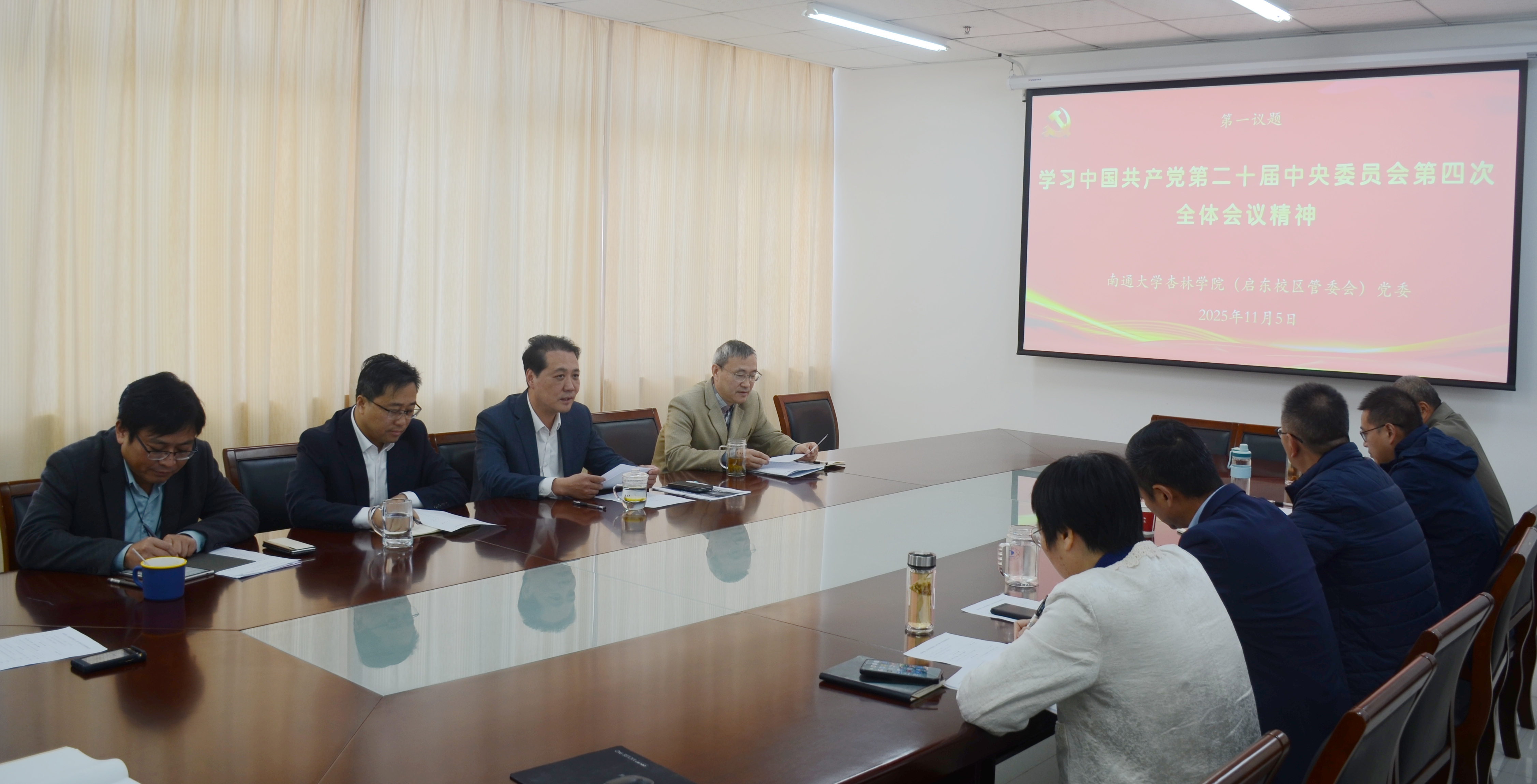 11月5日上午,学院(管委会)组织学习习近平总书记在党的二十届四中全会上的重要讲话和全会精神。学院(管委会)党委书记、启东校区管委会常务副主任朱晓阳领学。