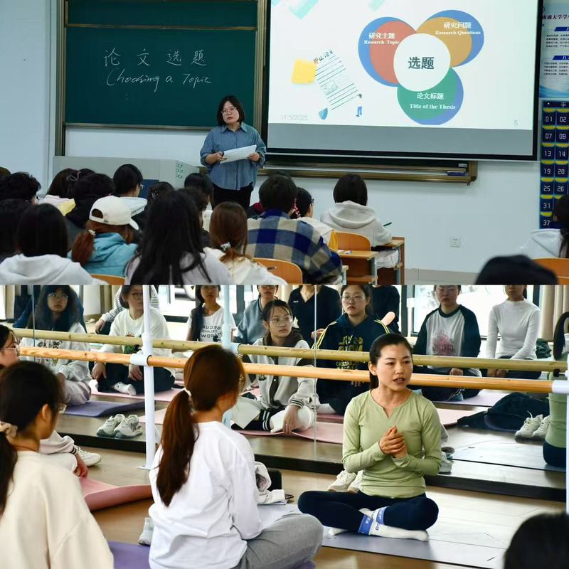李俊丽围绕《写作过程——选择合宜的题目》,通过导入“Chinese Culture Elements in the American Movies”这一话题,鼓励学生关注国家文化的传播与交流,运用讲授法、讨论法、案例教学法等方法讲授了论文选题的意义、原则。鼓励学生选择具有中国特色、体现中国文化的选题,挖掘学术论文写作中的思政元素,引导学生树立文化自信和创新意识,增强学生对中华文化的认同感。唐美彦讲授了《公共体育瑜伽选项课》课程内容,将瑜伽体式中创新融合中国传统五行哲学,通过木之伸展培养仁爱,土之根基锤炼担当,金之收敛铸就自律,将中医养生智慧与瑜伽体式自然贯通。学生在体式流动中感悟阴阳平衡的中华智慧,实现身心和谐与人格完善,彰显了“以体育人”的课程思政特色。