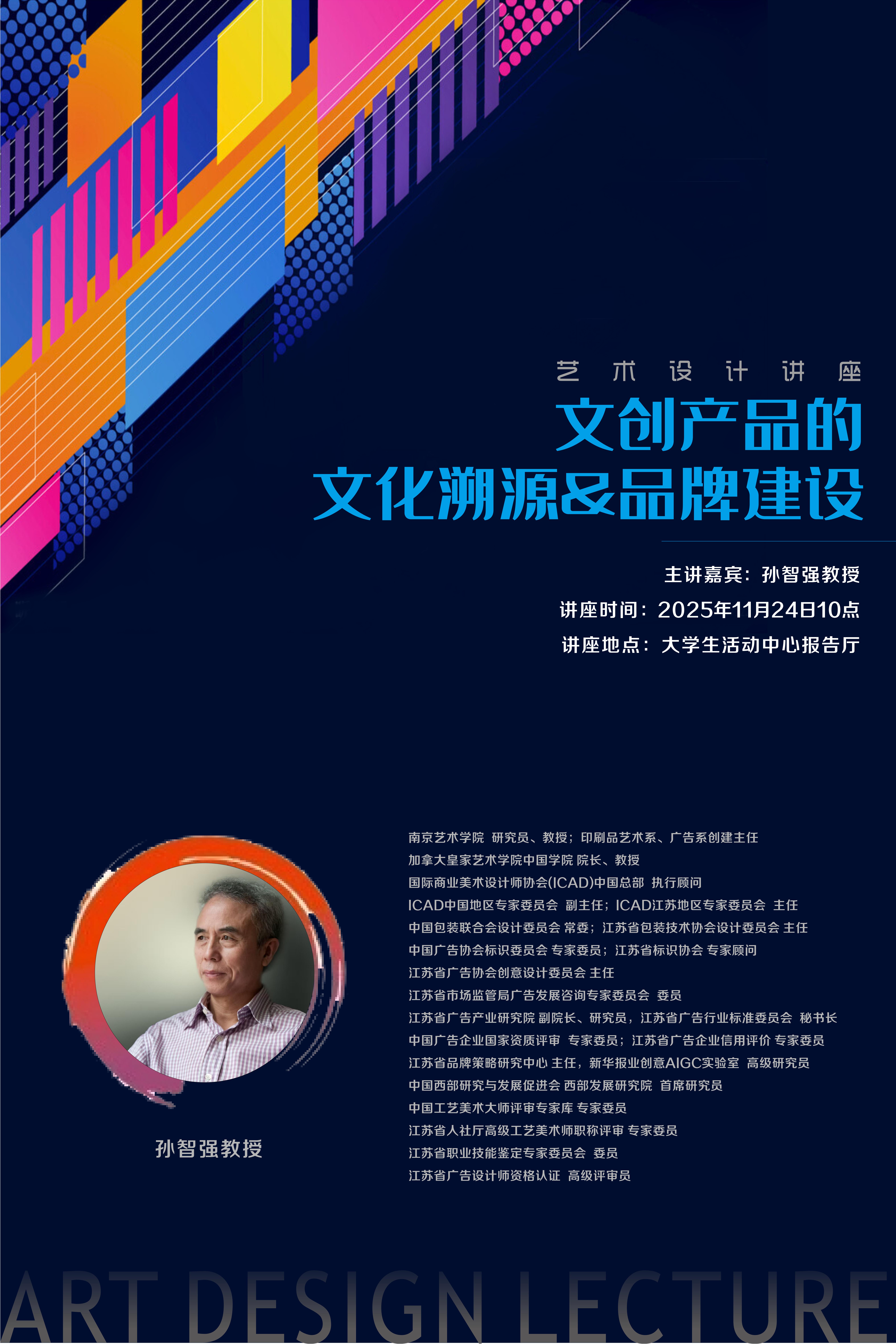 孙智强教授,数十所高校荣誉、客座教授,长期从事工艺美术、品牌美学、艺术传播、视觉创意、空间展示等教学、创作、研究工作。出版专著数部,数十篇论文发表在国家、省级专业刊物上;主持过近百项国家、省级项目、课题;设计完成数千件作品面市。兼任:《中国设计年鉴》编委,国际商业美术设计大赛评委、中国工艺美术“百鹤奖”评委、中国工艺美术文创大赛评委、“中国之星”艺术设计大赛评委、国际广告创意”艾菲奖“评委、国家公益广告创意大赛”黄河奖“、“长江杯”终审评委、中国东部地区广告设计大赛评委、教育部大学生广告创意大赛评委、华东地区“华东大奖”艺术设计大赛评委、长三角区域印艺大赛评委、西藏文化厅“文创西藏”设计大赛评委会主任、江苏省政府”紫金奖“评委、江苏省人社厅技能大赛评委会主任、江苏省品牌效能奖评委、江苏省优秀广告作品大赛评委、“江苏之星”艺术设计大赛首席评委、ICAD艺术设计大赛江苏地区评委会主任、江苏省广告行业技能大赛评委会主任、“新华杯”创意传播设计大赛评委等。
