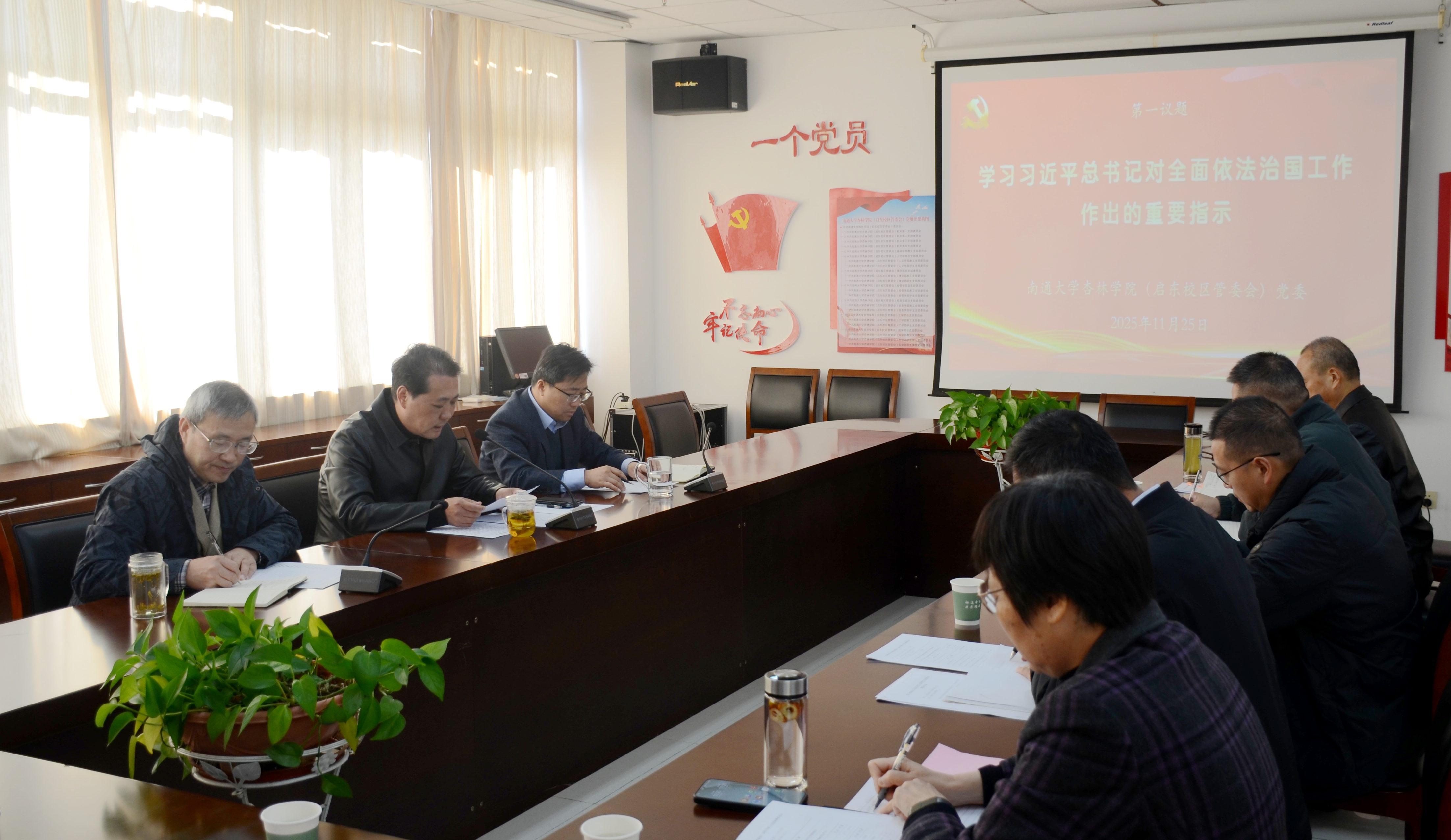 11月25日上午,学院(管委会)党委理论学习中心组在综合楼401开展集中学习,学习习近平总书记对全面依法治国工作作出的重要指示和习近平总书记重要文章《因地制宜发展新质生产力》。学院(管委会)党委书记、启东校区管委会常务副主任朱晓阳主持学习会。