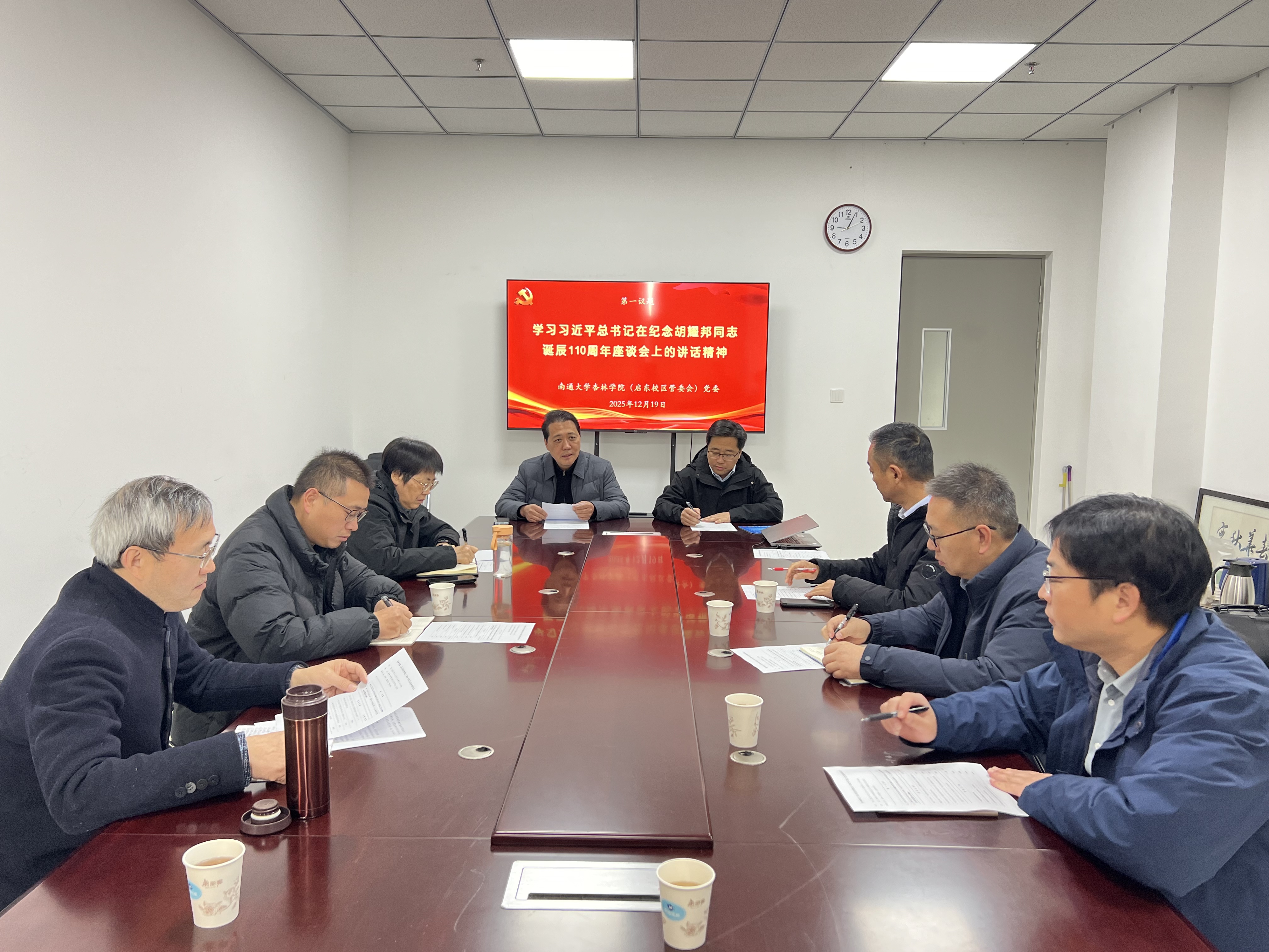 12月19日,南通大学杏林学院(启东校区管委会)党委召开专题学习会,集中学习习近平总书记在纪念胡耀邦同志诞辰110周年座谈会上的讲话精神,以及习近平总书记主持二十届中共中央政治局第二十三次集体学习时关于加强网络生态治理的重要讲话精神。学院(管委会)党委书记、启东校区管委会常务副主任朱晓阳领学。