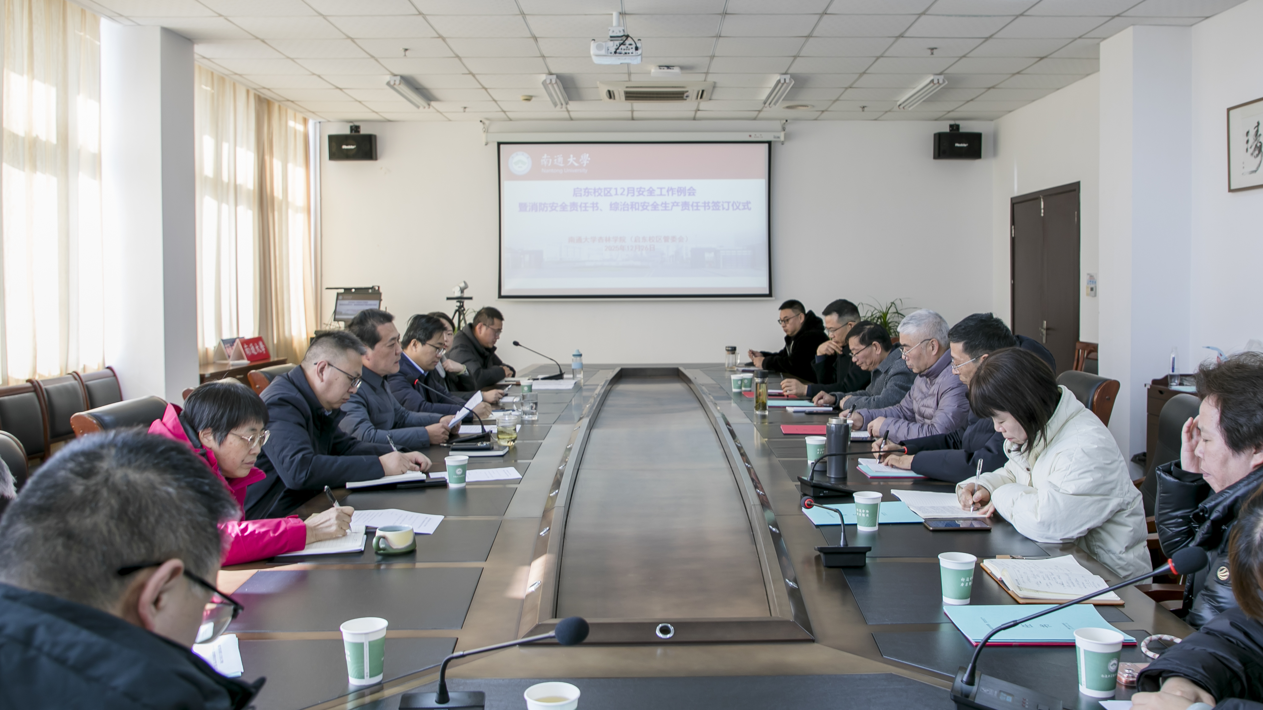 会上,朱晓阳与校区各部门主要负责人签订综合治理、消防安全责任书,进一步明确安全职责、压实主体责任。专题学习了《江苏省高等学校安全管理工作规定》,集中观看了南通市2025年学校消防事故安全警示片,集中学习了习近平对网络安全和信息化工作作出的重要指示精神。与会各部门围绕本部门安全工作开展情况进行了交流汇报。